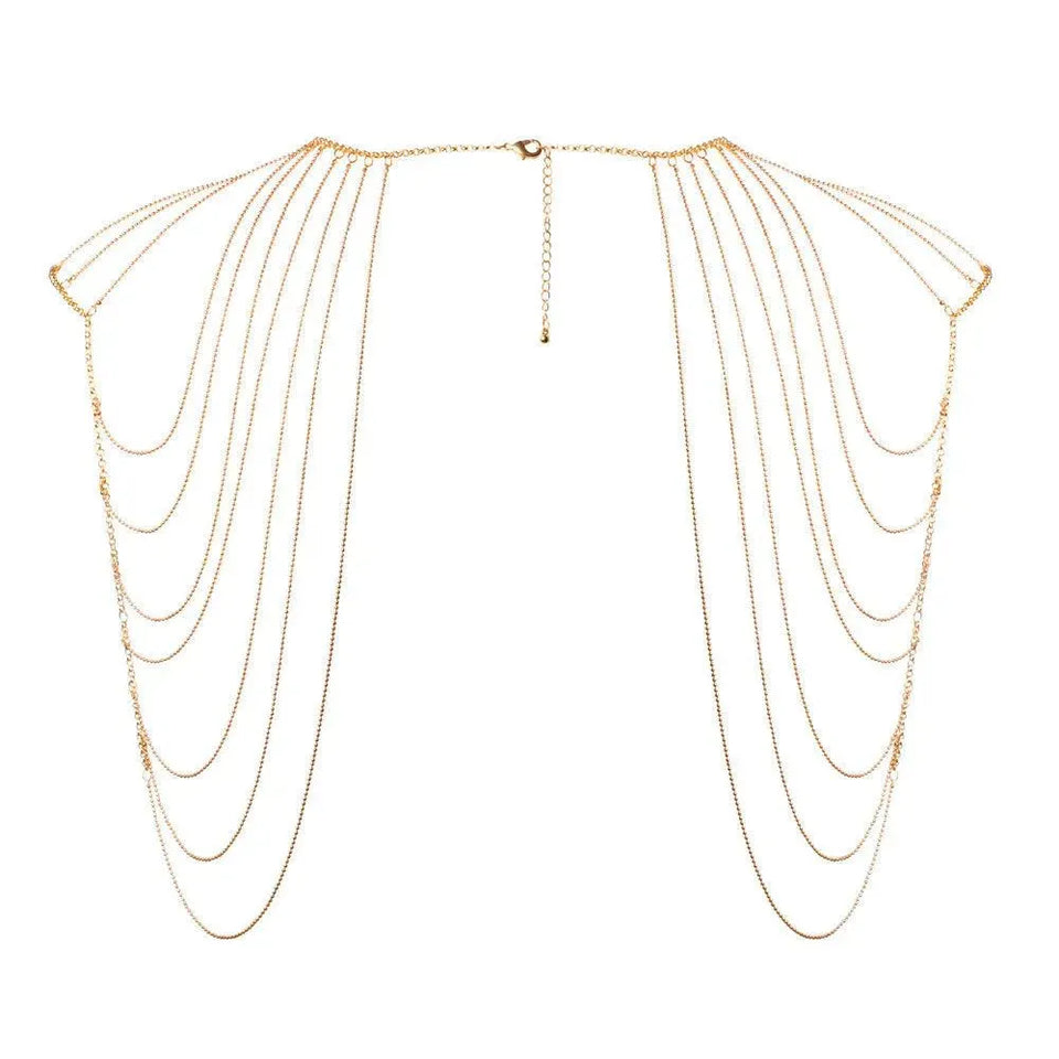 Whether you're looking to make a bold fashion statement or explore new dimensions in sensuality, the Bijoux Indiscrets Magnifique Shoulder Chain offers endless possibilities. Its exclusive design, combined with its luxurious gold finish, makes it the perfect addition to your jewellery collection or a daring gift for someone special.