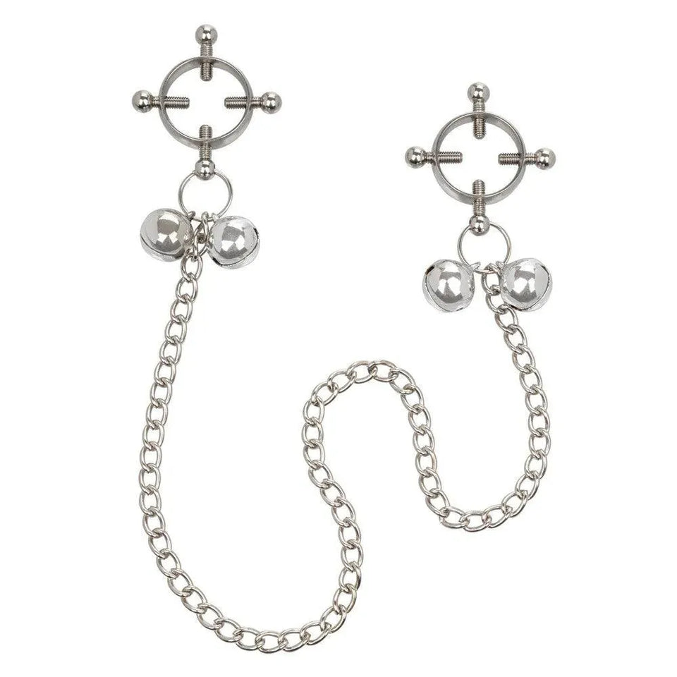 Spice up your intimate moments with the CalExotics 4-Point Nipple Press with Bells. Designed for those who enjoy exploring new sensations, this unique nipple press combines adjustability with playful elements. With a simple twist of the screws, you can control the pressure to create a customized experience that meets your desires. As you tighten the clamps, the accompanying bells provide delightful jingles, adding a fun auditory element to your nipple play.