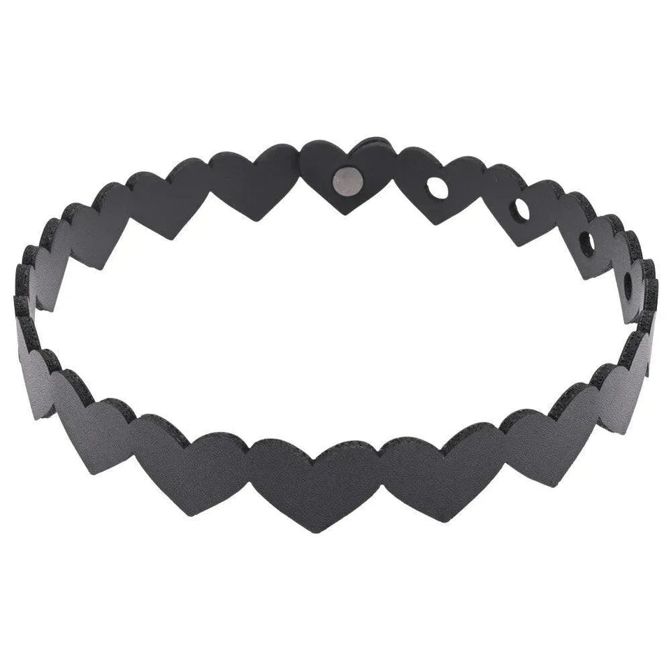 Add a touch of seduction and mystery to your look with the Sex & Mischief Heart Day Collar. This stunning choker-style necklace is designed to turn heads with its unique heart-shaped accents, creating an irresistible blend of elegance and allure. Made from supple faux leather, it provides a comfortable fit that can be worn all day without any discomfort. Whether you're looking to spice up your bedroom play or simply want to add a bit of edge to your everyday style, it is the perfect accessory.
