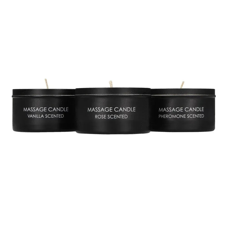 Turn up the heat and set the perfect mood with the Ouch! Massage Candles – a set of three luxurious products designed to heighten your sensual experiences. Each candle melts into a warm, aromatic massage oil that glides over the skin, creating a tantalizing and soothing sensation. With three captivating scents to choose from—Pheromone, Vanilla, and Rose—this set adds variety to your intimate moments, helping you explore different atmospheres with each use.