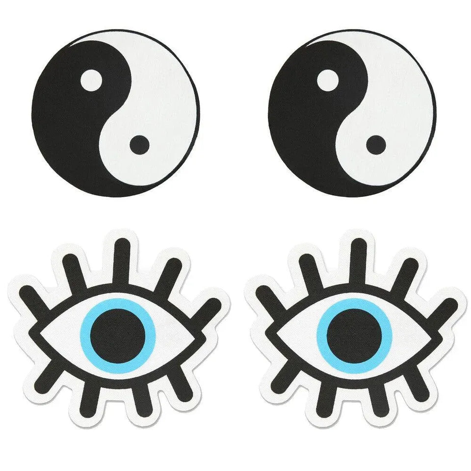The Peekaboos Yin & Yang Pasties bring a perfect balance of bold style and playful sophistication. This set includes two pairs of self-adhesive pasties—one featuring the timeless Yin and Yang design and the other showcasing a pair of Evil Eye motifs. Whether you're dressing up for a special event or adding a cheeky touch to your everyday look, they are the perfect way to express yourself.