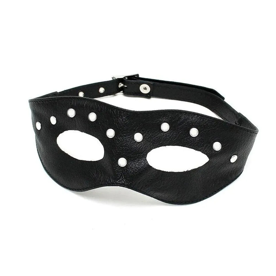 Enhance your sensory experience with the Rimba Open Eye Mask With Rivets, designed for those who crave a unique twist on traditional blindfolds. It features an open design that allows for complete visibility while still adding an element of intrigue and excitement to your intimate moments. Made from durable black leather, it showcases a stylish rivet decoration that elevates its aesthetic appeal, making it an eye-catching addition to your collection.