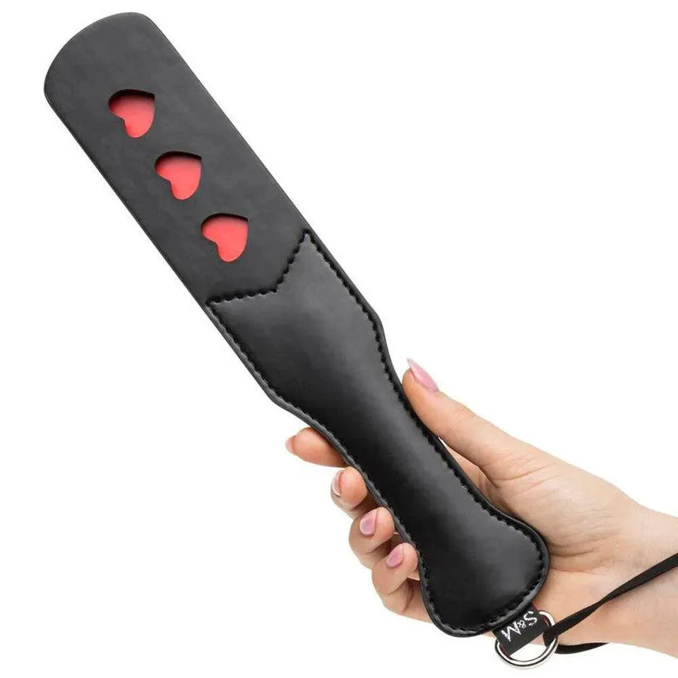 The Sex & Mischief Leather "Hearts" Impressions Paddle is an ideal choice for those who enjoy audible impact without the intensity of a full-throttle spanking. Made from high-quality vegan leather, this 12.5-inch tool features a split surface designed to deliver a satisfying slap with each strike. It leaves a heart-shaped impression on the skin, making it a fun and unique addition to your spanking collection.